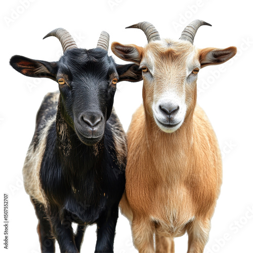 Male and female brown goat, The Nubian hornless billy-goat and his daughter, the young horned goat, isolated on transparent background