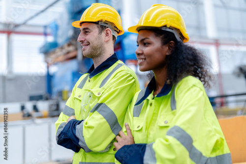 Male and female engineers in neat work clothes prepare and control the production system of large modern machines in a factory producing industrial technology products.