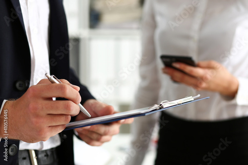 Male arm in suit hold silver pen and pad making note in office closeup. Deal consult, delivery signature, financial inspector job, fill survey form, discuss strategy, project negotiation concept