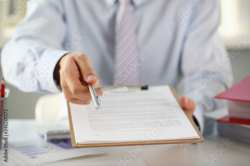 Male arm in suit offer contract form on