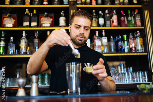 summing, adult, bar, barkeeper, barkeeper, barkeeper, beard, beverage, blur, citrous, cocktail, counter, fresh, from below, fruit, glasses, indoor, ingredient, job, lime, low angle, male, man, natural, nightclub, nightlife, owner, piece, portion, prepare, process, professional, eatery, serve, service, slice, small business, t-shirt, uniform, weekend, work