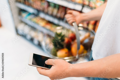 Male buyer hands with basket of fruits and phone