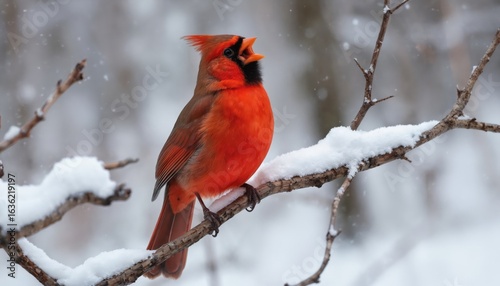 Male cardinal singing on snowy branch. Red bird perched in winter forest. Bright plumage contrasts with white snow. Wildlife photography, birdwatching theme, avian species in natural habitat.