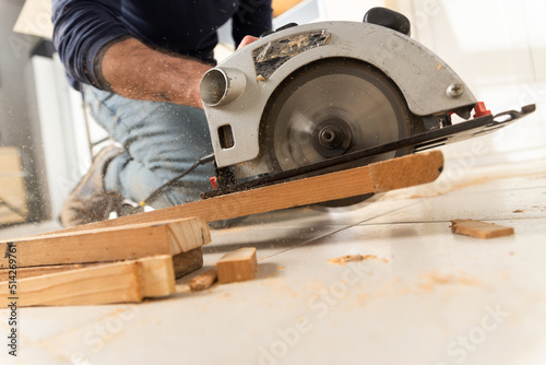 male carpenter working, cuts wood with a cutting machine, kneeling on the floor.