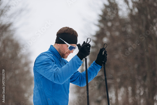 Male cross country skier actively training during winter