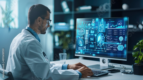 Male doctor analyzing complex medical data on a computer screen, highlighting modern healthcare technology and data analysis.