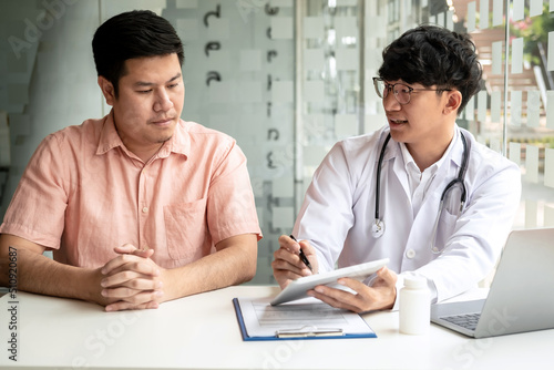 Male doctor holding health check documents and explaining the results of the examination to the patient