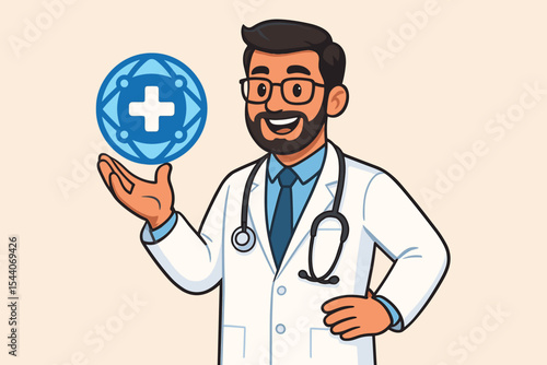 Male doctor holding network symbol for online medical consultation and virtual healthcare. Telemedicine and telehealth concept. Cartoon character for global health support. Vector.