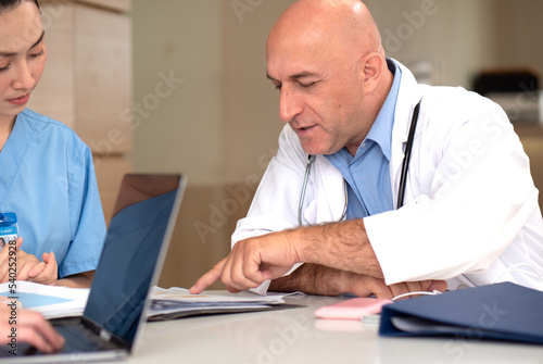 Male doctor meeting with medical teamwork woman in hospital. Professional healthcare expertise talking, explaining discussion with female nurse working in medical clinic. Health care business concept