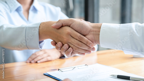 Male doctor shaking hands with female patient to congratulation after the treatment method successful