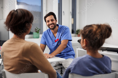examine, medical care, doctor, caring, patient, disease, adult, people, woman, appointment, family, family life, mother, eltern, children, daughter, man, health, diversity, nurse, horizontal, indoor, day, smiling, girl, several, three people, optimism, positive, ethnicity