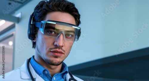 Male doctor wearing augmented reality goggles, abstract of future medicine