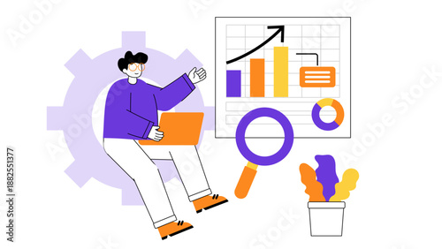 Male expert sitting on gear analyzing financial charts and bar graphs to optimize operational efficiency and market expansion