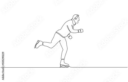 Male figure skater gliding elegantly on ice in minimalist style, continuous line drawing, Hand drawing one single continuous line of man ice skating isolated on white background.