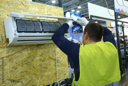 Male fitter assembling air conditioner with a screwdriver