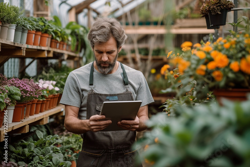 Male Florist Utilizing a Digital Tablet with Expertise While Tending to Plants at the Nursery, Embracing Modern Technology in Horticulture."