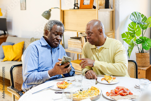 casual attire, conversation, diverse, eating, enjoy, food, friendship, puckered, group, home, indoor, leisure, living room, meal, party, retirement, reunion, smartphone, smile, table, together