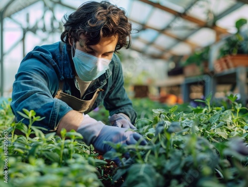 Male greenhouse worker wearing a mask and gloves tending to young plants