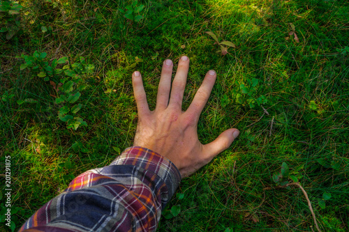 arm, detail, forest, green, ground, hand, male, man, moss, nature, 1, palm, people, person, soft, softness, summer, touching, wood