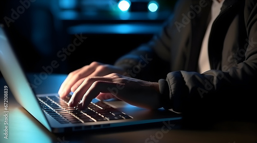 Male hands are typing on a laptop keyboard, a man works, develops a business, studies, plays a computer game at night.