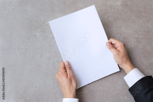 paper, hand, holding, hold, letter, page, man, male, card, business, empty, blank, sheet, copy space, poster, frame, banner, advertisement, white, person, businessman, document, paperwork, note, invoice, topview