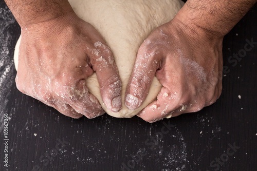 dough, food, flour, bake, cook, kneading, hand, male, man, young, yeast, bread, baking, cooking, cookery, kitchen, counter, table, pizza, baker, homemade, ingredient, pastry, preparation, receipe, rising, working, organic, vegan, wheat, chef, concept, craft, culinary, meal, person, closeup, pie, production, rustic, background, eatery, dark, bakery, black, photo