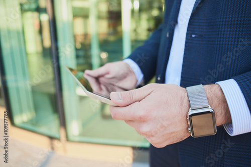business, finance, economy, businessman, hand, smart, watch, keep, tablet, technology, wristwatch, screen, touch, modern, contraption, intelligence, new, device, innovation, closeup, display, accessory, credit, male, professional, manager, work, job, entrepreneur, businessman, businessperson, financier, background, economist, banker, financial, businessperson, man, costume