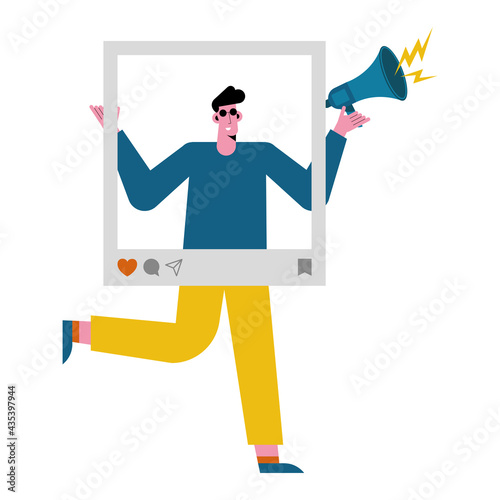 influence, audience, micro, social, template, web page, web, megaphone, sound, marketing, media, standing, popular, leader, blog, digital, online, addict, male, man, boy, brand, promotion, trend, vector, illustration