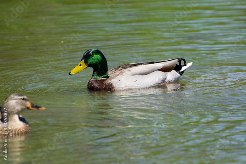 mallard duck, duck, male, female, bird, bird, wildlife, animal, nature, avian, lake, duck pond, bay, water, surface, swimming, green, head, feather, beak, bill, pair, 2, together, sunny, brown, beautiful, pretty, flock, migrate, migration, migratory, paddling, ripple, profile, looking, outdoors, spring, summer, family, calm, serene, peaceful, iridescent, shiny, dipping
