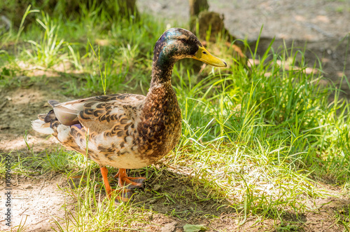 Male mallard duck taking some shade from the hot sun at Wayoh Reservoir, Bolton, Gtr Manchester, UK