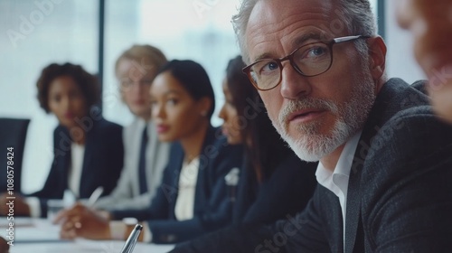 Male mature caucasian ceo businessman leader with diverse coworkers team, executive managers group at meeting. Multicultural professional businesspeople working together on research plan in boardroom.
