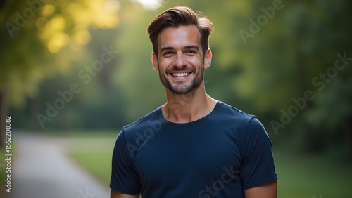 male, model, blue, t-shirt, fashion, casual attire, blank, apparel, wearable, cotton, minimal, clothing, style, soft, real, daylight, trendy, simple, urban, look, lifestyle, modern, everyday, relaxed, natural, fitted, display, comfort, outdoors, park, smiling, photogenic, smile, person, man, people, face, guy, outside