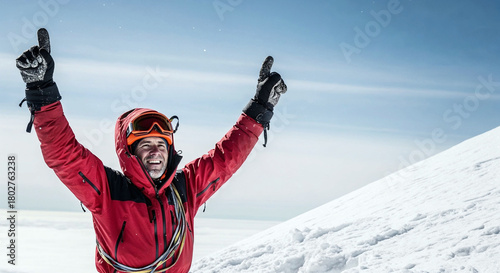 mountaineer, man, mountain, snow, peak, winter, celebration, happy, red jacket, achievement, adventure, joy, victory, freedom, fitness, nature, landscape, exploration, thrill, emotion, elevation, hiking, exhilaration, snow-capped, wilderness, triumph, high altitude, spirit, energetic, passion, expression, atmosphere, copy space