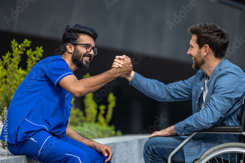 Male nurse in blue doctors overall shaking hands with a patient in wheelchair