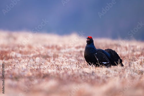 Male of black grouse, lyrurus tetrix, lekking on dry alpine meadow with open beak Majestic wild cock making sound in its natural habitat during mating season. Endangered blackcock with tail down