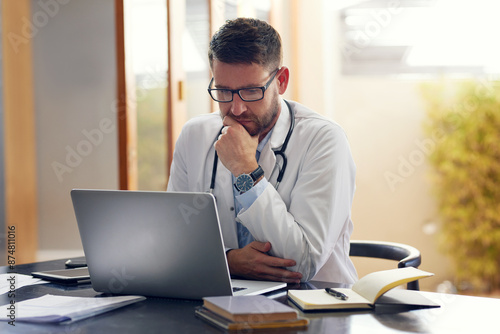 Male person, doctor and laptop with planning, ideas and thinking in office as medical professional. Man, pediatrician and diagnosis, telehealth and technology for patient records, medicine or surgery