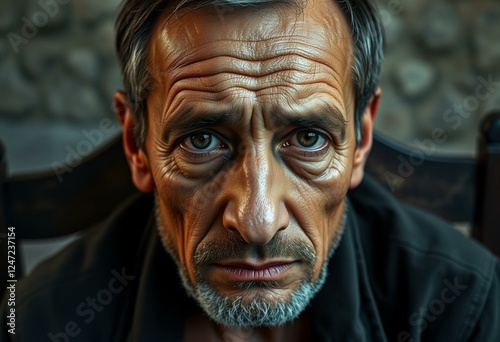 people, bright, dark, copy, portrait, partially, tiredness, neutral, contrast, space, wall, poor, human, chair, wooden, highlight, way, soft, male, natural, shadow, expression, sorrowful, stone, visible, body, high, lighting, facial, shadow