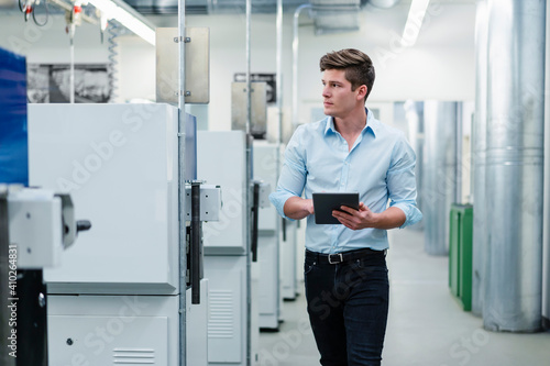 copy space, technology, 1, people, industry, computer, communication, adult, business, man, wireless technology, connection, businessman, businessperson, occupation, job, working, looking, young, young adult, adult, young men, male, walking, holding, caucasian, expertise, exam, examining, factory, industrial building, entrepreneur, manufacture, engineer, engineering, alone, machinery