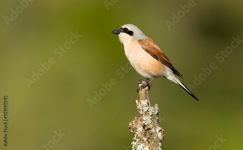 male Red-backed shrike on its nesting territory in a forest of oak and thorn bushes at the first light of a spring day