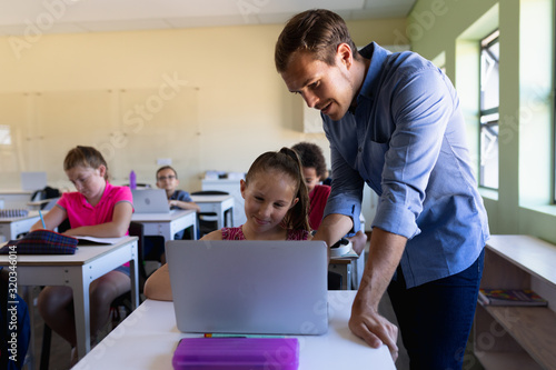 Male school teacher standing at the desk of schoolgirl using a laptop computer