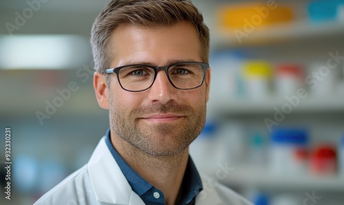 Male Scientist in a Vivid Lab Background: Focused Research and Innovation