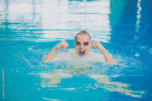 Male swimmer at the swimming pool. Underwater photo