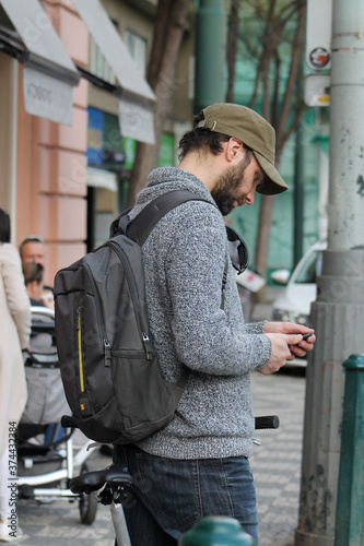 adult, backpack, beard, bicycle, building, cafes, cap, casual attire, caucasian, city, communicating, connecting, bicyclist, day, downtown, guy, cyberspace, looking, lost, male, man, map, pedestrian, people, person, phone, reading, road, route, searching, smartphone, standing, street, sweater, tour tourism, town, travel, urban, walking, white, young
