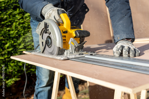 Male using electric circular saw to cut DIY sheet material outside