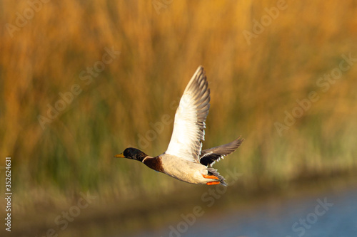 Male wild duck flying, seen in the wild in a North California marsh