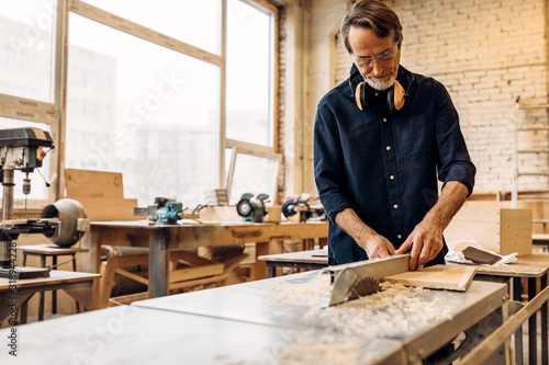 Male works in carpentry. Man adjusting saw machine.