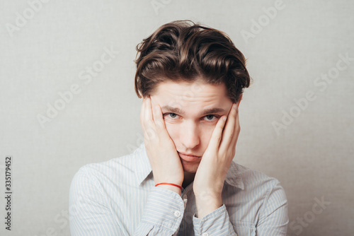 ache, adult, anguish, anxiety, background, care, caucasian, closeup, depression, expression, face, facial, fever, frustrated, frustration, grieving, grimace, guy, hand, photogenic, head, cephalalgia, health, bruised, ill, disease, male, man, migraine, monotone, office, pain, painful, person, portrait, problem, sick, painfully, stress, stressed, studio, suffer, symptom, sleepy, white, work, young