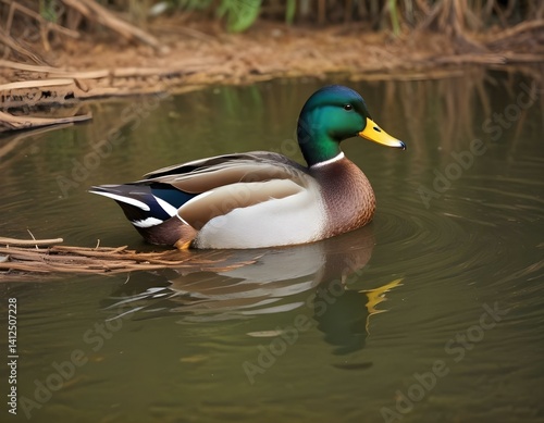 Mallard in the pond, Mallard males have green head and females with brown feathers. beautiful wild duck stands on a wooden surface.