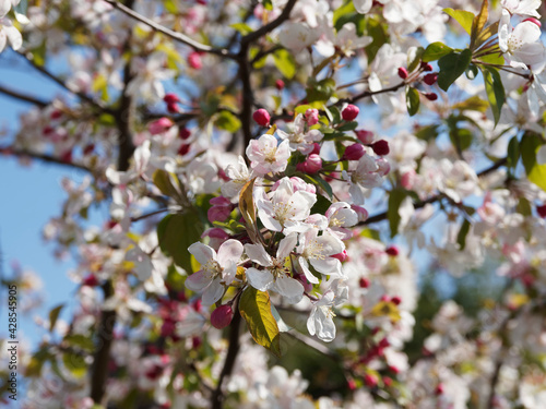 Malus floribunda or Japanese flowering crabapple, hybrid ornamental applecrab between malus sieboldii und baccata with magnificent spring bloom in white and pale pink