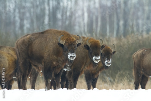 Mammals - wild nature European bison Bison bonasus Wisent herd standing on the winter snowy field North Eastern part of Poland, Europe Knyszynska Forest